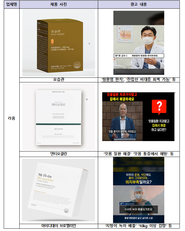 적발 업체 가운데 ‘라움’, 퍼널먼스, 우나더데이, 아이리스브라이트, 케이빅스 등 12개소는 AI로 생성한 의사·전문가 영상 등을 활용해 식품을 질병 치료제나 건강기능식품처럼 광고한 것으로 나타났으며, 이들 업체의 판매 규모는 약 84억 원에 달했다.