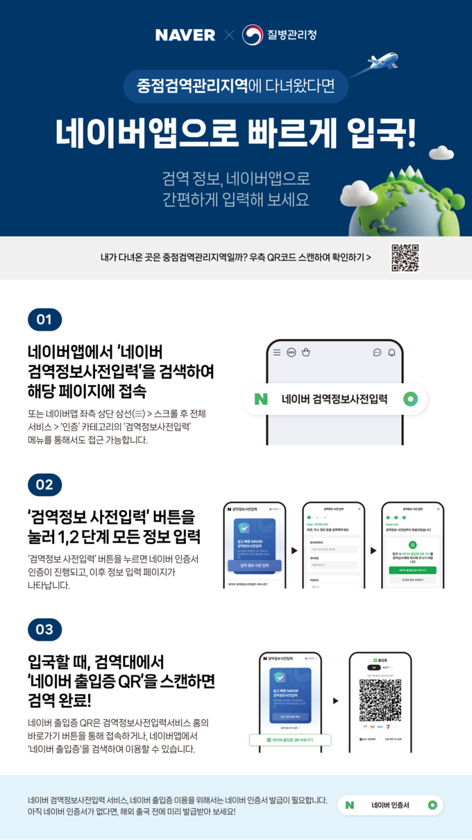 이번 서비스는 네이버에서 네이버 검역정보사전입력을 검색하거나 네이버앱 메뉴를 통해 바로 이용할 수 있으며, 기존 질병관리청의 Q-CODE 누리집에서도 접속 링크를 제공하고 있다.
