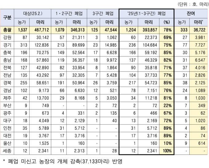 2025년 폐업 신고 결과에서 주목할 만한 점은 2026~2027년 폐업 예정이었던 농장들의 적극적인 조기 폐업 동참했고, 이행계획 상 폐업시기를 올해 이후로 제출한 농장(636호) 중 53%(337호)가 폐업하였으며 마지막 폐업 예정 농장(507호) 중 52%(264호)도 이미 폐업을 완료했다.
