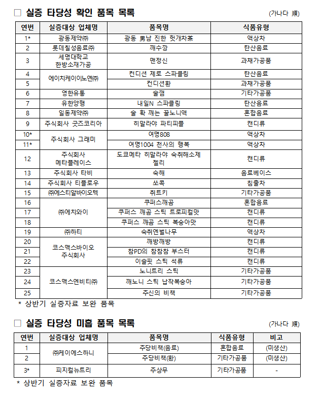 반면 케이에스하니의 ‘주당비책(음료·환)’과 피지컬뉴트리의 ‘주상무’는 실증자료의 신뢰성이 충분하지 않다고 판단돼 하반기 실증에서도 기준을 통과하지 못했다. 이들 제품은 2026년부터 숙취해소 표현을 사용할 수 없다. 앞서 미래생명자원, 벨벳케어, 조아제약, 케이지이, 한풍제약 등 일부 업체는 상반기 보완자료를 제출하지 않아 이미 숙취해소 표시·광고가 중단된 상태다.