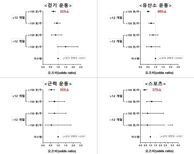 분석 결과, 운동을 전혀 하지 않는 집단과 비교했을 때 운동을 수행한 경우 우울 증상 위험이 유의미하게 낮았는데, 각 운동별 위험 감소의 정도는 차이가 있었고, 걷기 운동을 하는 경우 우울 증상 위험이 19% 낮은 반면, 유산소 운동, 근력 운동, 스포츠 활동은 각각 41%, 40%, 46% 낮은 것으로 나타났다고 질병청은 설명했다.