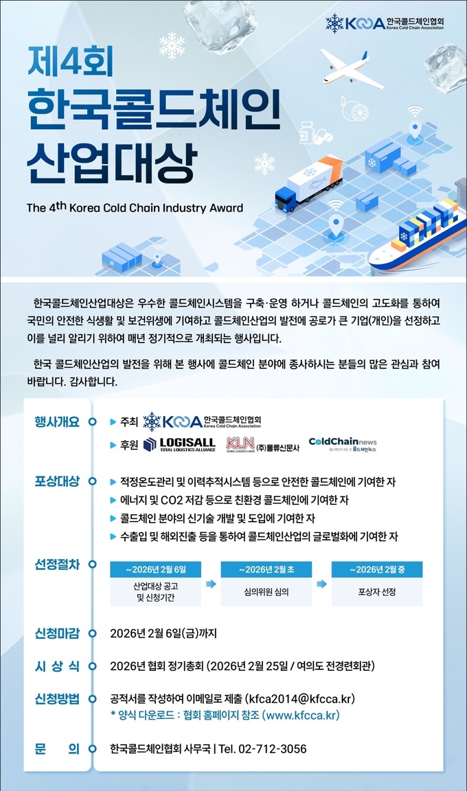 [푸드투데이 = 황인선기자] 한국콜드체인협회(회장 서병륜)는 한국 콜드체인 산업발전에 기여한 기업(개인)을 대상으로 내달 6일까지 ‘제4회 한국콜드체인산업대상(The 4th Korea Cold Chain Industry Award)’을 수상할 후보 신청을 받는다고 8일 밝혔다.