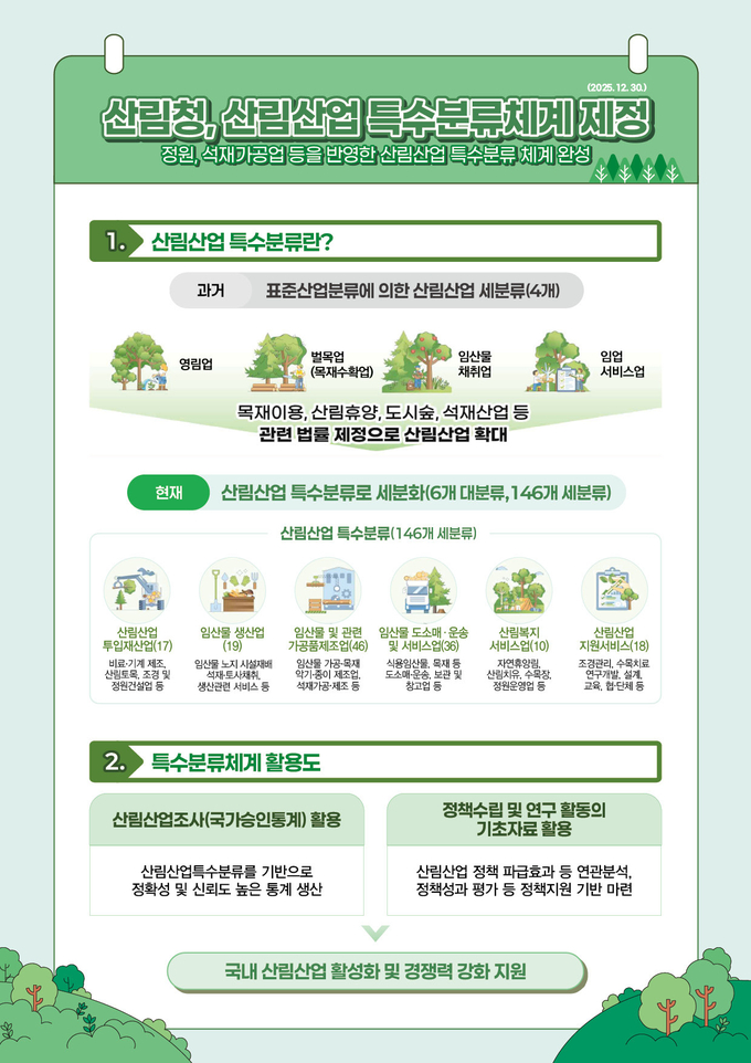 [푸드투데이 = 노태영기자] 산림청(청장 김인호)과 국가데이터처(처장 안형준)는 산림산업의 구조 변화와 정책 수요를 반영한 분류를 확대한 산림산업 특수분류를 제정해, 2025년 12월 30일자로 시행했다고 9일 밝혔다.