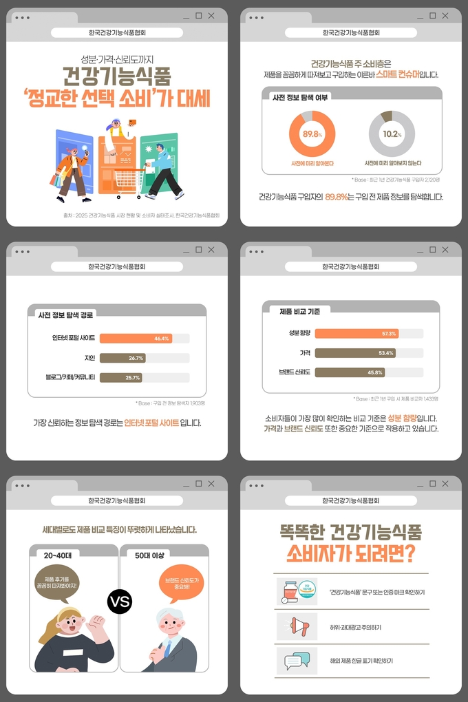 건기식협회 관계자는 “소비자들이 건강기능식품 구매 전 성분 함량과 가격, 정보 출처 등을 꼼꼼히 확인하는 경향이 뚜렷해지고 있다”며, “필요에 맞는 제품을 정확히 이해하고 합리적으로 선택할 수 있도록 관련 정보를 지속적으로 제공하겠다”고 말했다.