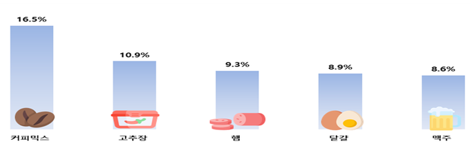 제품별로 보면 전년 동기 대비 상승률 상위 10개 제품의 평균 상승률은 11.1%였다. 남양유업 ‘프렌치카페 카페믹스’가 18.9%로 가장 크게 올랐고, 동서식품 ‘맥심 모카골드 믹스’도 14.5% 상승했다. 고추장·햄·라면·맥주·아이스크림 등 가공식품 전반과 세탁세제 같은 생활용품 가격 상승도 확인됐다.