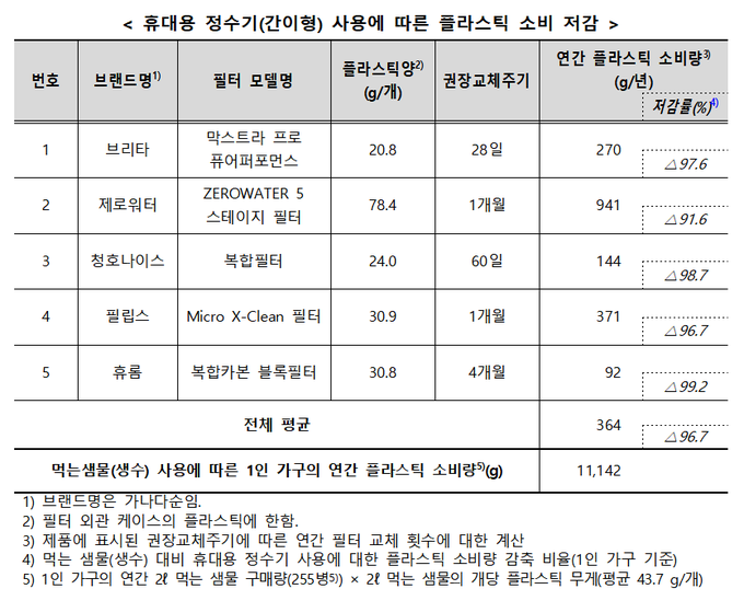 [푸드투데이 = 황인선기자] 휴대용 정수기를 사용할 경우 먹는 샘물(생수) 대비 플라스틱 소비량을 90% 이상 줄일 수 있는 것으로 나타났다. 다만 정수 성능의 세부 항목과 필터 유지비용, 표시 적합성에서는 제품 간 격차가 컸다.