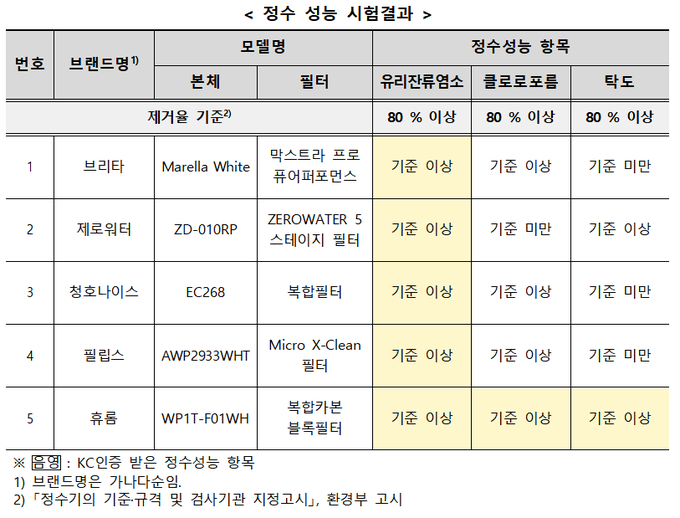 시험 결과, 모든 제품이 KC 인증을 받은 정수 성능 항목에서는 기준을 충족했지만, 제거 대상 물질별 성능과 유효정수량, 여과속도에서는 차이를 보였다. 휴롬(WP1T-F01WH)은 유리잔류염소·클로로포름·탁도 등 3개 항목에서 모두 기준을 만족했으며, 브리타·청호나이스·필립스는 유리잔류염소와 클로로포름, 제로워터는 유리잔류염소와 탁도 항목에서 기준 이상의 제거 성능을 보였다.