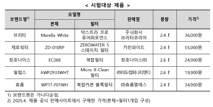 한국소비자원(원장 윤수현)은 29일 시중에 유통 중인 휴대용 정수기 5개 제품을 대상으로 정수 성능, 안전성, 환경성, 경제성 등을 시험·평가한 결과를 공개했다. 시험 대상은 브리타, 제로워터, 청호나이스, 필립스, 휴롬 제품으로, 3대 이커머스 플랫폼에서 공통으로 판매되는 3ℓ 미만 저용량 제품이다.