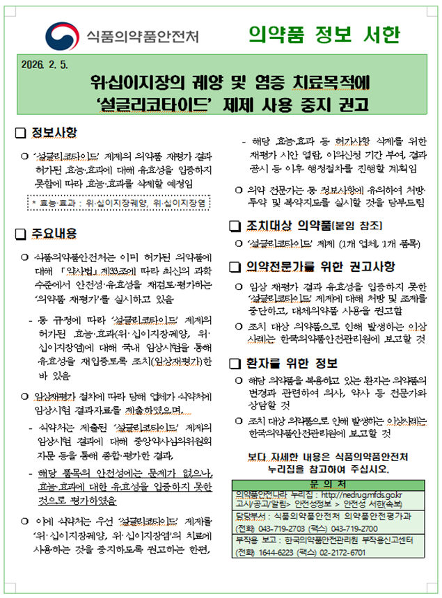 [푸드투데이 = 황인선기자] 식품의약품안전처(처장 오유경)는 의약품 안전성‧유효성 재평가 결과 ‘위‧십이지장궤양, 위‧십이지장염’에 대해 유효성을 입증하지 못한 ‘설글리코타이드’ 제제의 사용을 중지하고 다른 대체의약품을 사용하도록 권고하는 의약품 정보 서한을 5일 의·약사 및 환자 등에게 배포했다고 밝혔다.