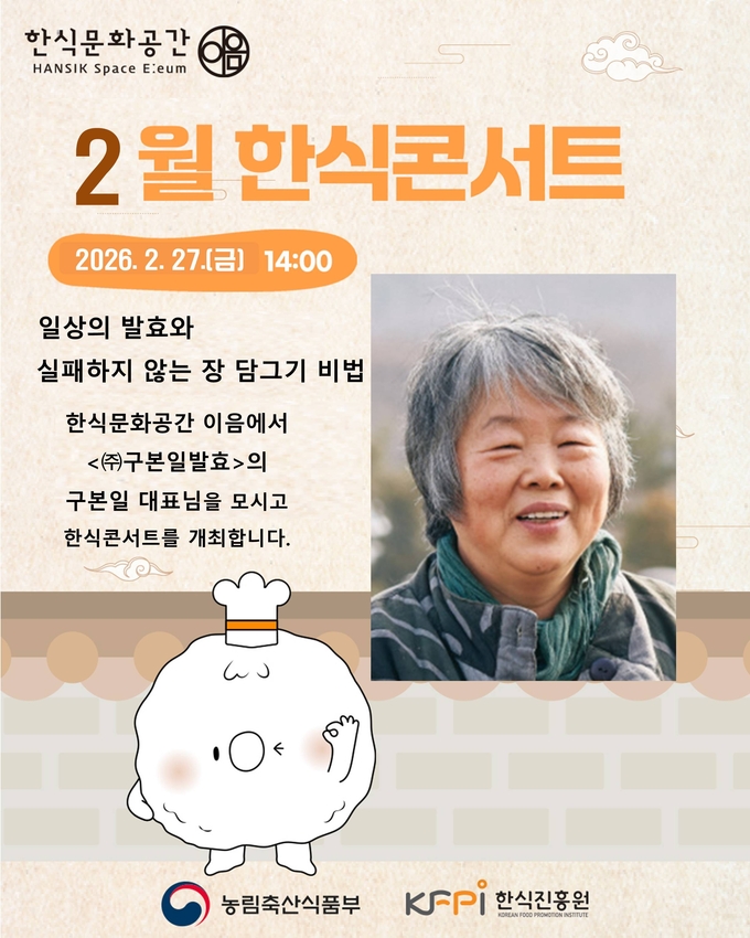 [푸드투데이 = 노태영기자] 농림축산식품부(장관 송미령, 이하 농식품부)와 한식진흥원(이사장 이규민) 주최, 주관하는 2월 한식콘서트가 오는 27일 서울시 종로구 한식문화공간 이음에서 개최한다.