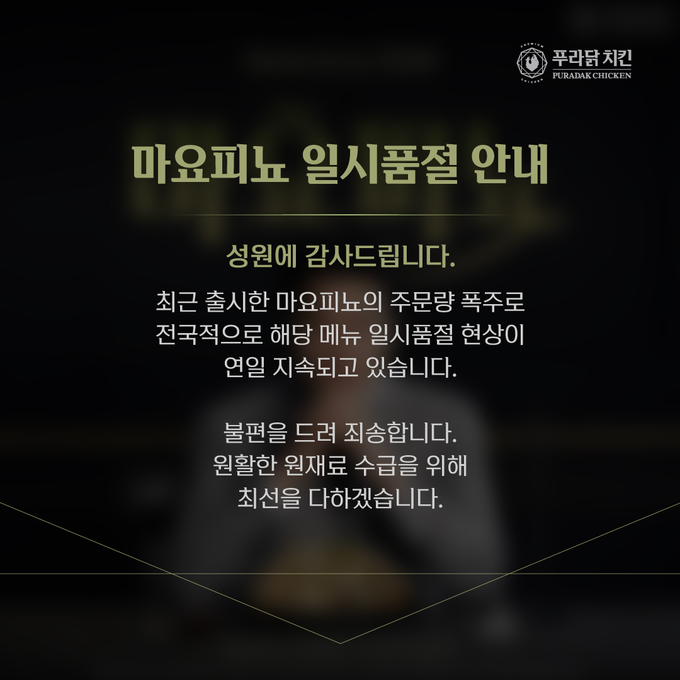 푸라닭 치킨을 운영하는 아이더스에프앤비 서기원 부대표는 "안성재 셰프님의 마스터링 덕분에 탄생한 ‘마요피뇨’는 푸라닭이 추구하는 치킨의 가치와 특별한 미식경험에 대한 고객님들의 니즈가 동시에 충족된 완성도 높은 메뉴”라고 전하며 “원재료를 철저히 준비했음에도 불구하고 예상을 뛰어넘는 폭발적인 반응을 보내주신 고객분들께 정말 감사드린다. 많은 고객께서 불편함 없이 마요피뇨를 즐기실 수 있도록 원활한 재료 수급은 물론 좋은 품질과 서비스로 기대 이상의 경험을 제공할 수 있도록 최선을 다하겠다”라고 전했다.