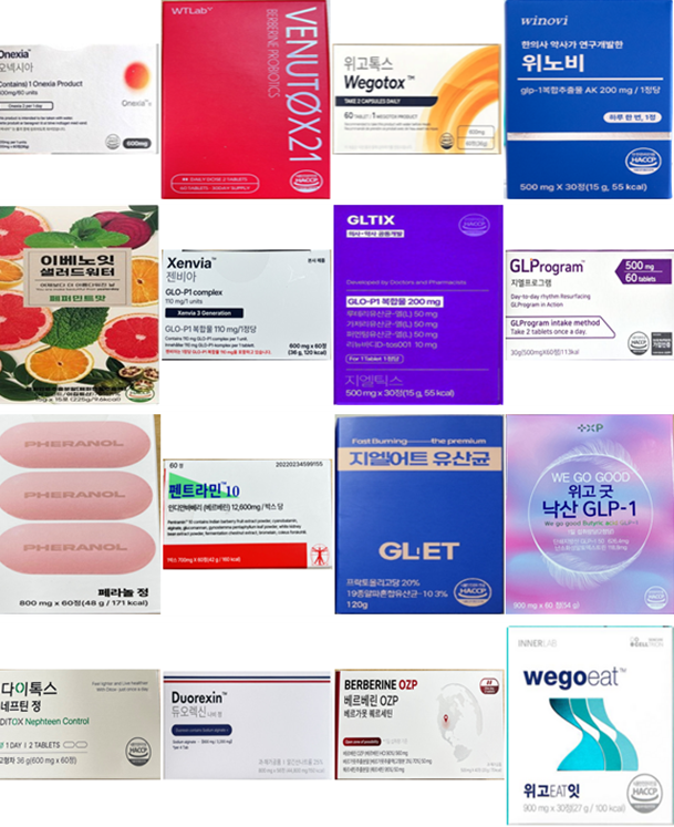 조사 대상은 ▲다이톡스 네프틴 정 ▲듀오렉신 나비정 ▲베르베린 OZP 베르가못 퀘르세틴 ▲셀트리온 이너랩 위고잇 ▲오넥시아 ▲웰티랩 비너톡스21 베르베린 유산균 ▲위고톡스 Wegotox ▲위노비 ▲이베노잇 샐러드워터 페퍼민트맛 ▲젠비아 ▲지엘틱스 ▲지엘프로그램 ▲페라놀 정 ▲펜트라민정 ▲Fast Burning 지엘어트 유산균 the premium ▲WE GO GOOD 위고굿 낙산 GLP-1 등 16개 제품이다.
