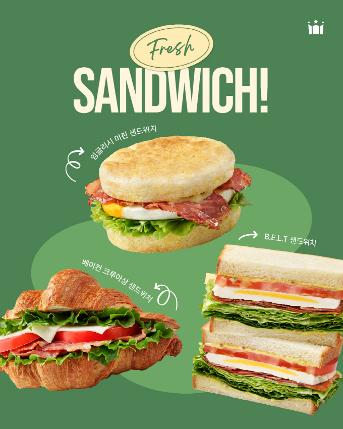 먼저 ‘B.E.L.T 샌드위치’는 베이컨, 계란, 양상추, 토마토가 조화롭게 어우러져 신선함을 입안 가득 느낄 수 있는 샌드위치다. 짭짤한 베이컨에 부드러운 달걀, 아삭한 채소가 균형을 이루며 정석의 샌드위치 맛을 즐길 수 있다. 유럽 연합 인증제도 AOP 인증을 받은 버터를 사용해 더욱 깊고 진한 풍미를 선사하는 크루아상으로 만든 ‘베이컨 크루아상 샌드위치’도 있다. 겉은 바삭하고 속은 촉촉한 크루아상에 훈연한 베이컨과 치즈를 듬뿍 넣어 짭짤함과 고소함이 조화를 이룬다. 맛의 균형을 잡아주는 로메인까지 더해 든든하게 즐길 수 있다. ‘잉글리시 머핀 샌드위치’는 쫄깃한 잉글리시 머핀에 달걀, 베이컨, 양상추를 넣어 담백하면서도 고소한 맛이 일품이다.