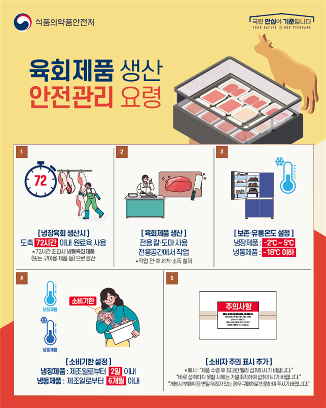 식약처는 생식용 식육의 안전관리를 위해 생산(도축장) 부터 제조·유통·소비 단계별 안전관리를 위해 ‘생식용 식육 제품 안전관리 가이드라인'을 마련해 축산물위생교육기관, 관련 협회 등을 통해 업계에 지속적인 교육․홍보를 하고 있다.