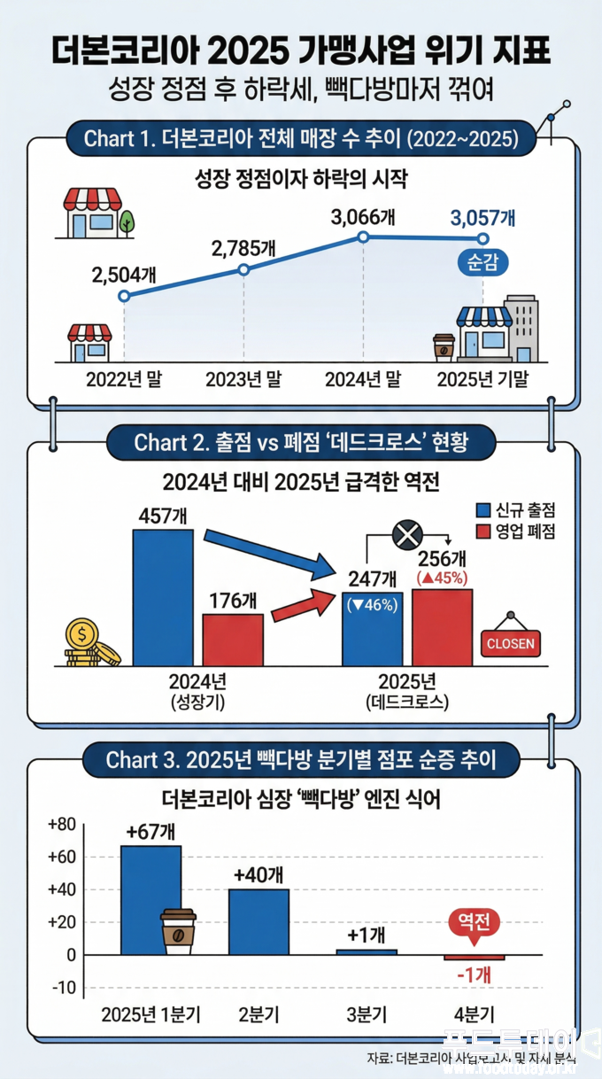 더본코리아가 지난 23일 공개한 사업보고서에 따르면 지난해 더본코리아 가맹점은 247곳이 출점하는 동안 256곳이 폐점한 것으로 공시됐다. 2024년 457곳이 출점하고, 176곳이 폐점한 것과 극명하게 대조된다.