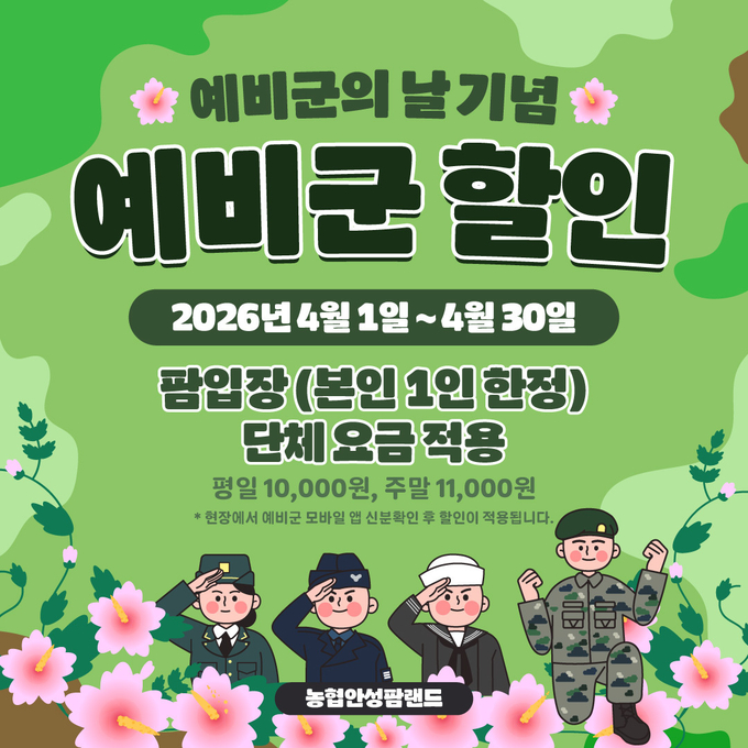 안성팜랜드 관계자는 “국가 안보를 위해 헌신하는 예비군들에게 감사의 마음을 전하고자 이번 이벤트를 준비했다”며, “안성팜랜드의 다양한 체험 프로그램과 즐거운 추억을 만들길 바란다”고 말했다.