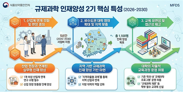 사업에 선정된 기관들은 앞으로 5년간(2026~2030년) 총 347억을 지원받으며, 학위과정 및 비학위과정을 포함해 규제과학 전문성과 실무역량을 동시에 갖춘 총 1,100명의 규제과학 전문인력을 체계적으로 양성한다.