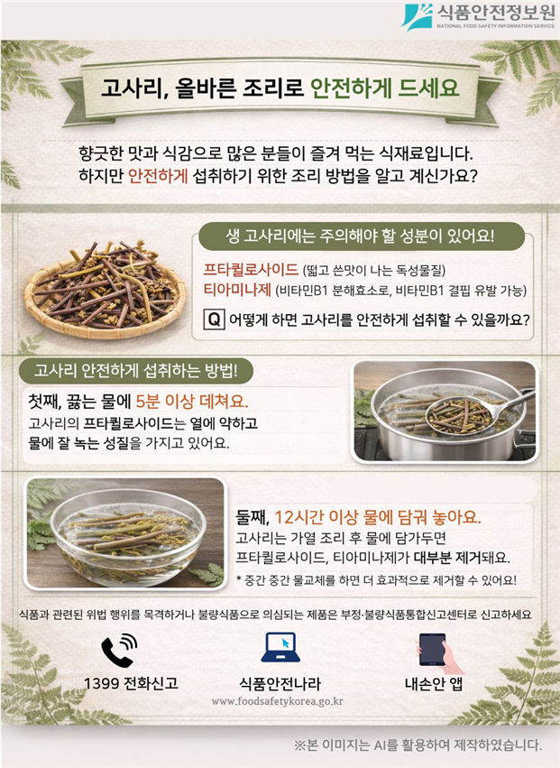 식품안전정보원(원장 이재용)은 13일 고사리를 보다 안전하게 섭취할 수 있도록 ‘고사리 올바른 조리법’ 가이드를 공개하고, 독성 성분 특성과 조리 시 유의사항을 안내했다.
