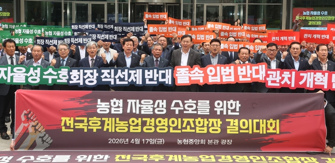 [푸드투데이 = 황인선기자] 전국후계농업경영인조합장협의회(회장 박정수, 이하 협의회)가 17일 서울 중구 농협중앙회 본관 광장에서 '농협 자율성 보장촉구' 결의대회를 개최했다.