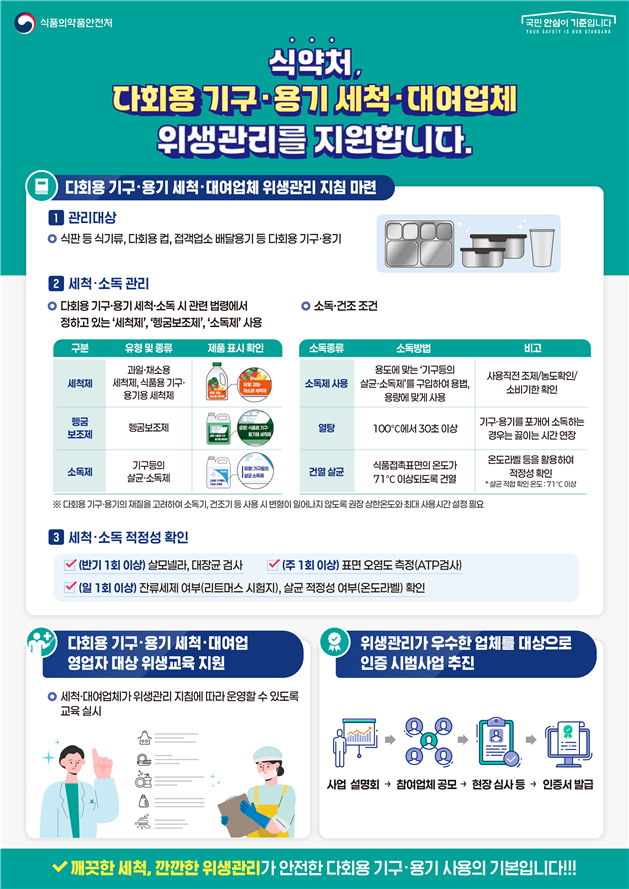 [푸드투데이 = 황인선기자] 식품의약품안전처(처장 오유경)는 다회용 기구·용기의 위생 및 안전관리 강화를 위해 ‘다회용 기구·용기 세척·대여업체 위생관리 지침’을 마련해 배포한다고 21일 밝혔다.