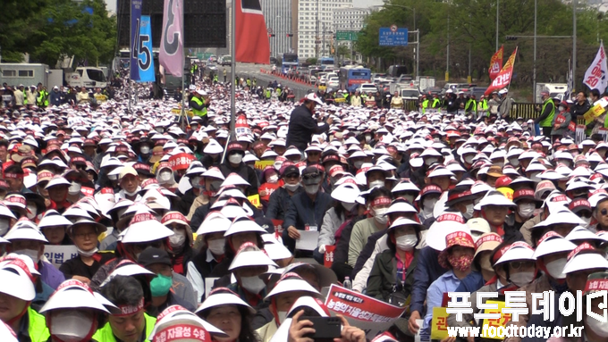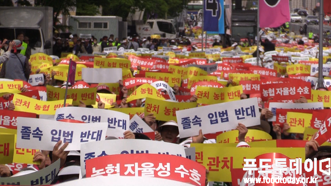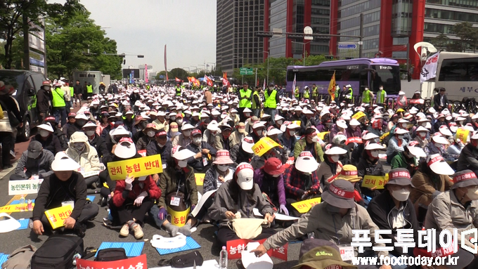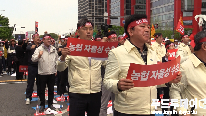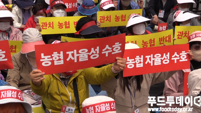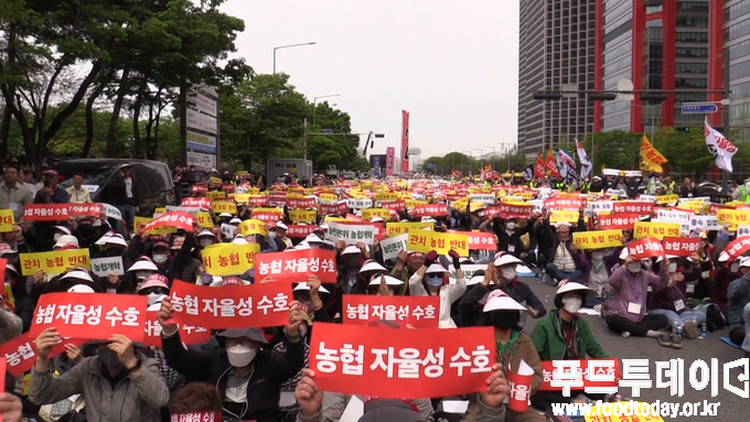 [푸드투데이 = 노태영기자] 전국 농축협 조합장과 농민 약 2만여 명은 21일 오후 서울 여의도에서 정부의 농협법 개정안에 대해 반대하는 농협 자율성 수호 농민 결의대회를 열었다.