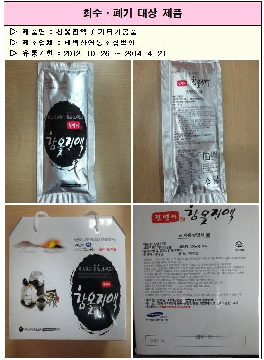 식품의약품안전처(처장 정승)는 식품에 사용할 수 없는 원료나 무표시 제품을 원료로 사용해 제조한 ‘태백산영농조합법인’(강원도 강릉시 소재) ‘개사철쑥(개똥쑥)즙’(액상차) 등 5개 제품과 ‘나무와사람들’(강원도 원주 소재) ‘원주참옻’ 등 2개 제품을 회수·폐기 조치했다고 31일 밝혔다.