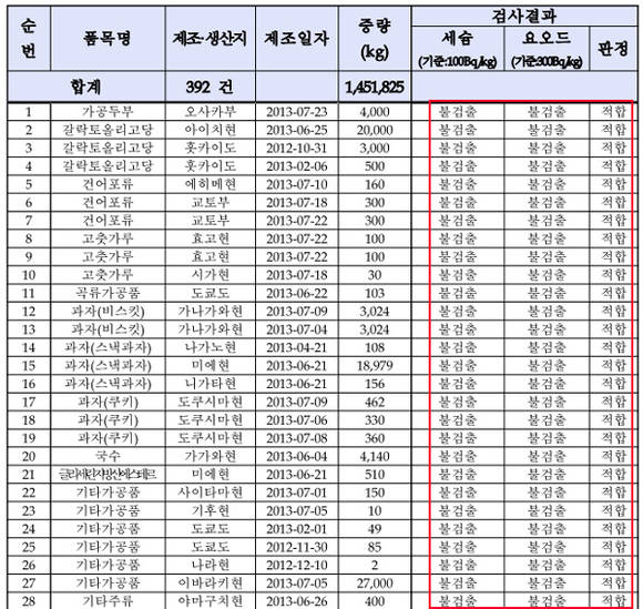 실제 식품의약품안전처 일본산 수입식품 검사 현황을 살펴보면 후쿠시마현 수입물가공품과 과자, 캔디 등 가공식품이 수입되고 있다. 다행히 모두 세귬과 요오드는 검출되지 않았다.