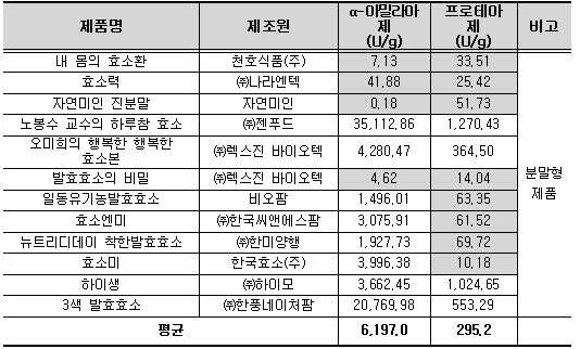 특히 천호식품의‘내 몸의 효소환’, 나라엔텍‘효소력’, 자연미인 ‘자연미인 진분말’, 렉스진 바이오텍‘발효효소의 비밀’4개 제품의 α-아밀라아제 함량은 0.2∼41.9(U/g), 천호식품‘내 몸의 효소환’, 나라엔텍‘효소력’, 자연미인‘자연미인 진분말’, 렉스진 바이오텍‘발효효소의 비밀’, 비오팜‘일동유기농 발효효소’, 한국씨앤에스팜‘효소앤미’, 한미양행‘뉴트리디데이 착한발효효소’, 한국효소‘효소미’8개 제품의 프로테아제 함량은 10.2∼69.7(U/g) 수준으로 타 제품에 비해 낮게 나타났다.