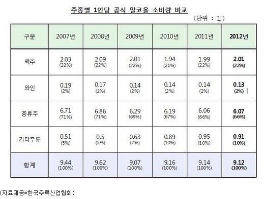 한국주류산업협회(회장 권기룡)가 2012년의 국내주류출고량 및 수입량 등을 근거로 15세 이상 우리나라 국민을 대상으로 알코올 소비량을 조사한 결과 1인당 평균 9.16리터(공식소비량 9.12리터, 비공식소비량 0.04리터)인 것으로 나타났다.