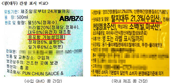 경실련에 따르면 수입품인 중국식 간장 ‘상노두소스’의 경우 원재료로 사용된 대두에 대해 “유전자 재조합 콩포함 가능성 있음”이라고 명확히 표시돼 있었다. 반면 국내에서 제조해 판매하고 있는 특정 간장 제품의 경우 '수입산 탈지대두 21.3%'가 주원료로 사용됐지만 GMO 관련내용의 표시는 찾아볼 수 없었다.