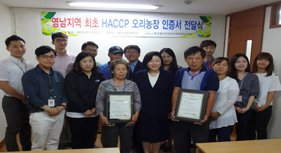 이날 HACCP 인증서를 전달받은 다오리농장(이시국 대표)와 억조농장(이선이 대표)은 각각 2만1천수와 1만8천수 규모의 육용오리 농장으로 약 7개월간의 준비기간을 거쳐 지난 6월 2일 HACCP 농장으로 최종 인증됐다.