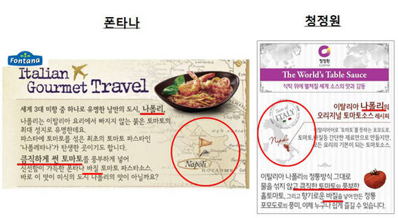 샘표는 청정원은 파스타소스를 리뉴얼 출시하면서 폰타나 파스타소스 제품 컨셉을 그대로 도용해 제품 패키지, 출시 보도자료 등에 그대로 사용했다고 주장했다. 지역별 지도를 표기하는 등 제품 패키지에 적용된 디자인과 설명문구는 물론, 매장행사의 상품판매대배너광고(POSM)에도 인용했다는 것이다.