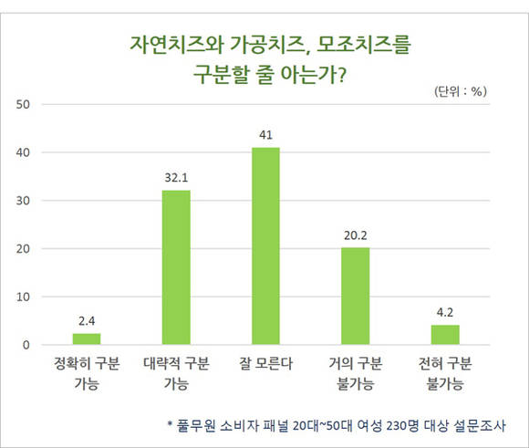 하지만 치즈에 대해 제대로 알고 구매하는 소비자는 많지 않다. 이에, 풀무원 식품은 소비자 패널 224명을 대상으로 ‘올바른 치즈 인식’에 대한 설문조사를 실시했다. 그 결과, 치즈 구매시 선택기준은 ‘브랜드’라는 대답이 31.9%에 달했고, 치즈가 ‘자연치즈’와 ‘가공치즈’, ‘모조치즈’로 나뉜다는 사실을 알고 있는 소비자는 51.5%인 절반에 그쳤다. 특히 자연치즈와 가공치즈를 정확히 구분하는 소비자는 3.0%에 불과한 것으로 나타났다.