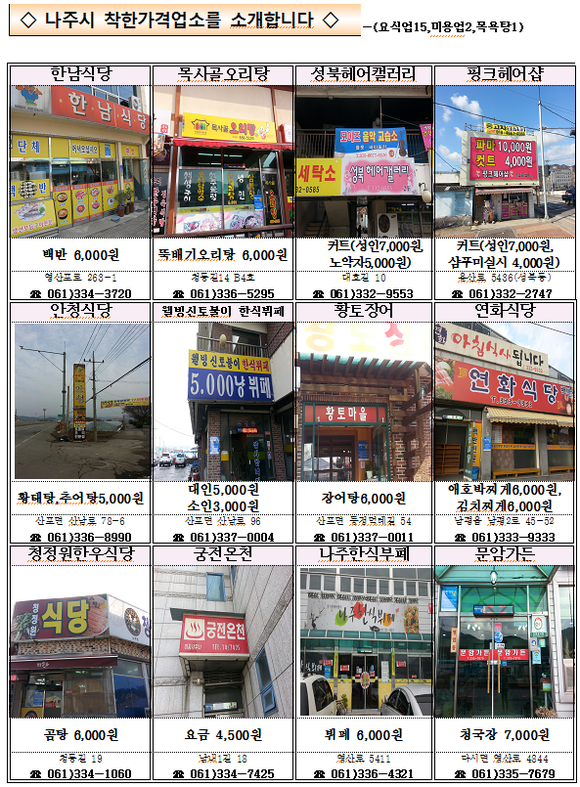 착한 가격업소는 가격수준과 영업장 위생·청결, 종사자의 친절도 등을 현지실사를 톧해 평가하여 전라남도와 행정자치부의 협의·조정을 거쳐 결정되는 것으로, 나주지역에서는 요식업 15곳, 미용업 2곳, 목욕탕 1곳이 선정됐다.