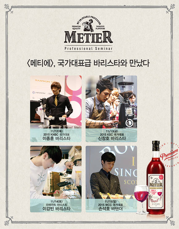 CJ제일제당은 오늘부터 15일까지 서울 삼성동 코엑스에서 열리는2015 서울카페쇼 ‘메티에(METIER) 체험관’에서 국가대표급 바리스타4인을 초청해 고객과 함께 하는 스페셜 세미나와 메티에 메뉴 시연 등 이벤트를 펼친다.