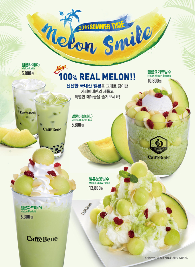 이번 시즌메뉴 ‘멜론 스마일(Melon Smile)’은 달콤한 메론의 향과 맛을 그대로 즐길 수 있게 국내산 멜론을 생멜론 그대로 사용한 것이 특징으로 행복하게 웃는 모습을 닮은 멜론의 모습을 콘셉트로 담았다. 특히, 여름 시즌을 겨냥해 출시한 멜론 빙수 2종과 시원한 멜론 음료 3 종이 함께 출시되어 총 5종의 다양한 메뉴로 소비자 선택의 폭을 넓혔다.