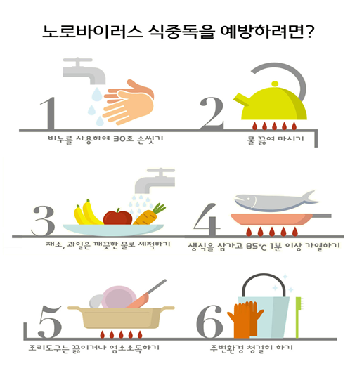 특히 노로바이러스는 입자가 작고 표면 부착력이 강하므로 30초 이상 비누나 세정제를 이용해 손가락, 손등까지 깨끗이 씻고 흐르는 물로 헹궈야 한다.