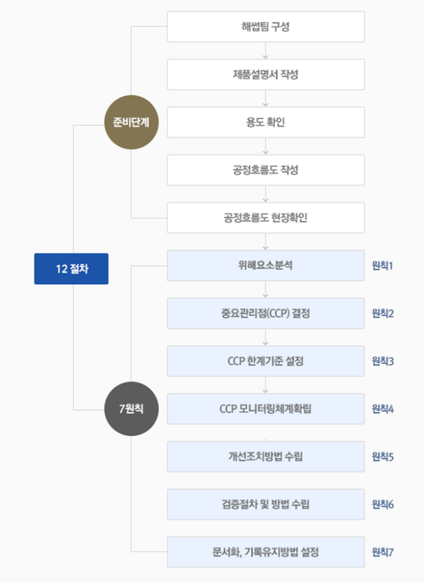 해썹은 팀 구성, 제품설명서 작성, 용도 확인, 공정흐름도 작성, 작업현장과 일치 확인의 예비 5단계와 위해요소 분석, 중요관리점 결정, 한계기준 설정, 감시방법 설정, 개선조치 방법 설정, 검증방법 설정, 기록유지 방법 설정 등 해썹 7원칙을 적용해 운영되고 있다.