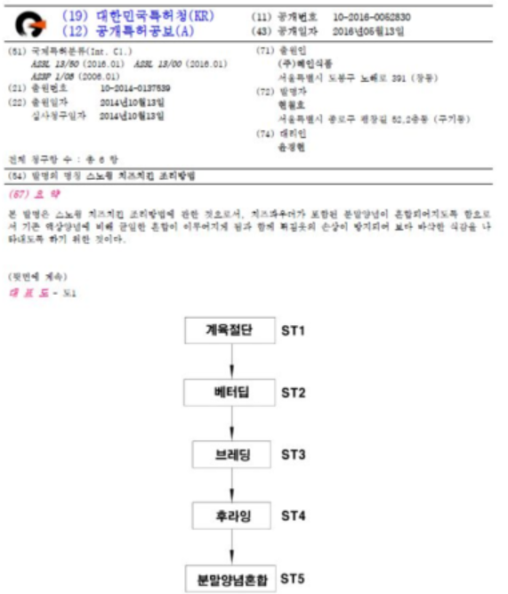 '제10-2014-0137539호 스노윙 치즈치킨 조리방법' 특허 내용에 따르면 '본 발명은 소노위 치즈치킨 조리방법에 관한 것으로 치즈파우더가 포함된 분말양념이 혼합되어지도록 함으로서 기존 액상양념에 비해 균일한 혼합이 이루어지게 됨과 함께 튀김옷의 손상이 방지돼 보다 바삭한 식감을 나타내도록 위하 위한 것이다'라고 돼 있다.