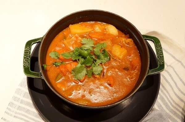4. 홀토마토의 과육을 으깨서 넣은 후 치킨 스톡을 넣고 끓이기 시작하고, 이때 감자를 잘게 잘라서 넣는다.
