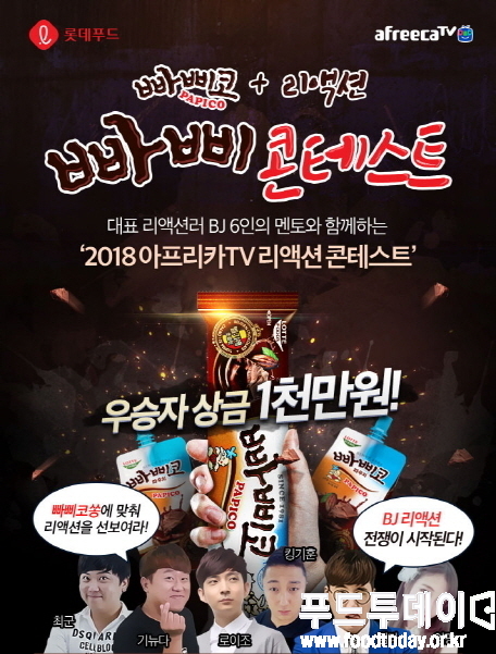 [푸드투데이 = 조성윤기자] 롯데푸드는 아프리카TV와 함께  26일부터 8월 25일까지 빠삐코 BJ리액션 콘테스트 ‘빠삐콘테스트’를 개최한다. 인터넷 방송을 진행하는 BJ는 리액션 응모로, 시청자는 리액션 콘테스트 투표로 참여할 수 있는 이벤트다.