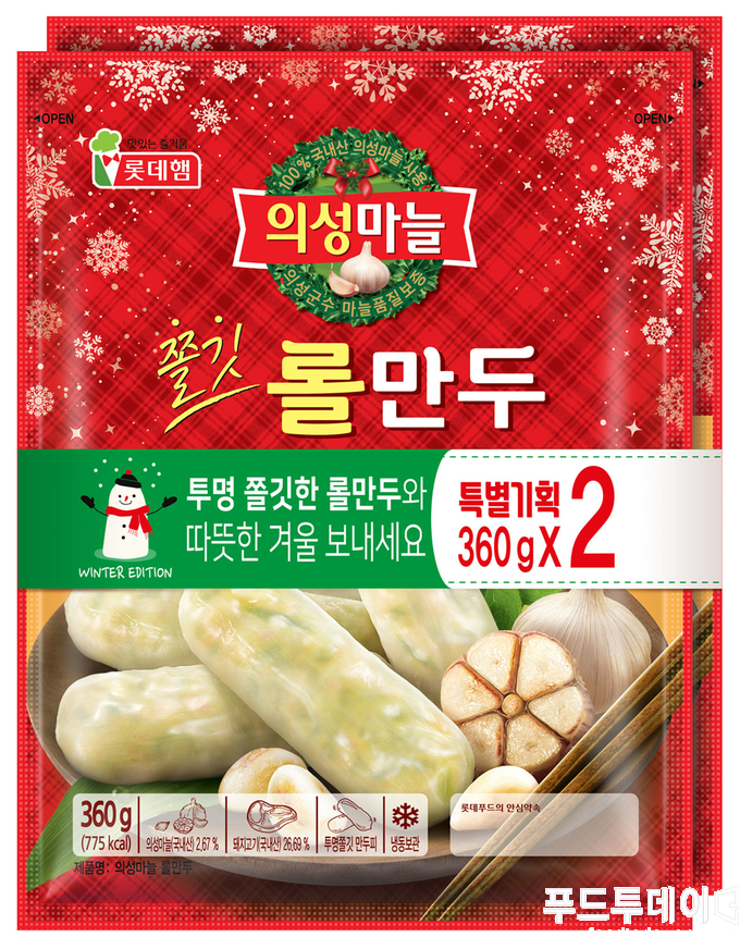 ‘의성마늘 롤만두’는 라이스페이퍼 만두피를 사용해 작은 롤 모양으로 만든 이색 만두다. 이번 겨울을 맞아 연말 파티 분위기에 잘 어울리는 새 디자인의 ‘의성마늘 롤만두 겨울 에디션’으로 출시됐다. 새하얀 눈의 이미지, 크리스마스 리스 형태의 의성마늘 로고, 롤만두를 활용한 눈사람 캐릭터 등을 적용해 겨울 분위기를 살린 것이 특징이다.
