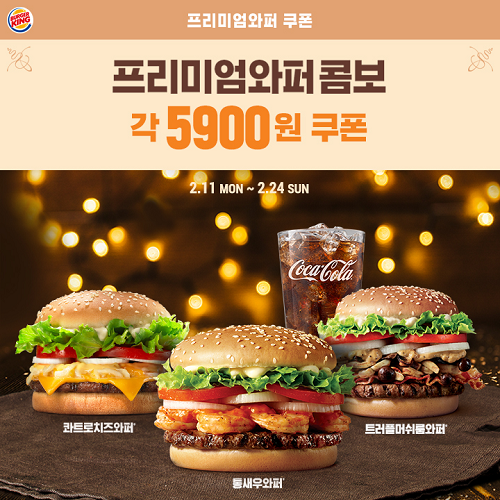 버거킹은 오는 24일까지 통새우와퍼, 콰트로치즈와퍼, 트러플머쉬룸와퍼 등 인기 프리미엄 와퍼 3종 중 1개와 코카 콜라(R)를 단돈 5900원에 구매할 수 있는 할인 쿠폰을 카카오톡 플러스친구를 통해 증정한다. ‘프리미엄 와퍼 콤보 5900원’ 쿠폰을 사용하면 해당 버거 메뉴를 단품으로 구매했을 때보다 더 저렴한 가격에 음료까지 추가하는 혜택을 누릴 수 있다.