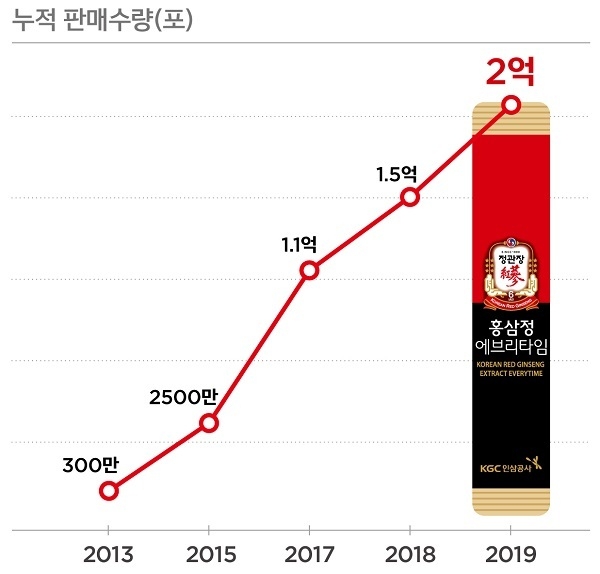 2012년 출시 후 ‘정관장 홍삼정 에브리타임’의 누적 판매수량은 2013년 300만포, 2015년 2500만포, 2017년 1억1000만포로 급속히 성장하면서 2019년에는 2억포를 돌파하며 성장세를 이어가고 있다.
