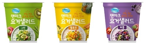 ‘덴마크 요거샐러드’ 3종은 각각 초록색, 노란색, 보라색 계열의 과채가 들어있어 아삭아삭한 식감과 풍부한 영양을 다양하게 섭취할 수 있다. ‘덴마크 요거샐러드 그린’에는 디톡스에 좋은 아스파라거스, 샐러리, 청피망, 키위 등이, ‘덴마크 요거샐러드 옐로우’에는 면역 기능을 향상시키는 것으로 알려진 단호박, 당근, 파인애플, 옥수수 등이 들어있다. ‘덴마크 요거샐러드 퍼플’에는 항산화 기능이 탁월한 블루베리, 적색양배추, 적피망 등이 담겨 있다.