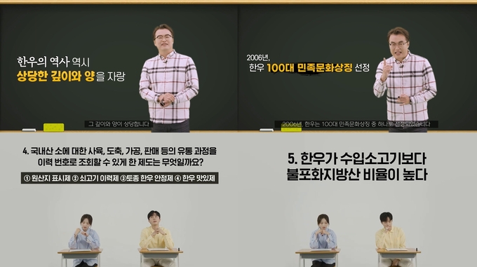 ‘큰별쌤’ 최태성 한국사 강사의 ‘우리 한우의 역사’편에서는 우리나라 역사 속 한우의 의미에 대해 알아보는 다양한 역사와 정보를 알기 쉽게 전달하고 있다. 또한 ‘한우 탐구영역 시험!’편에서는 일반인 출연자들이 등장해 간단한 퀴즈를 풀면서 한우에 대한 오해를 해소하고 올바른 정보를 얻어가는 내용을 담고 있다.