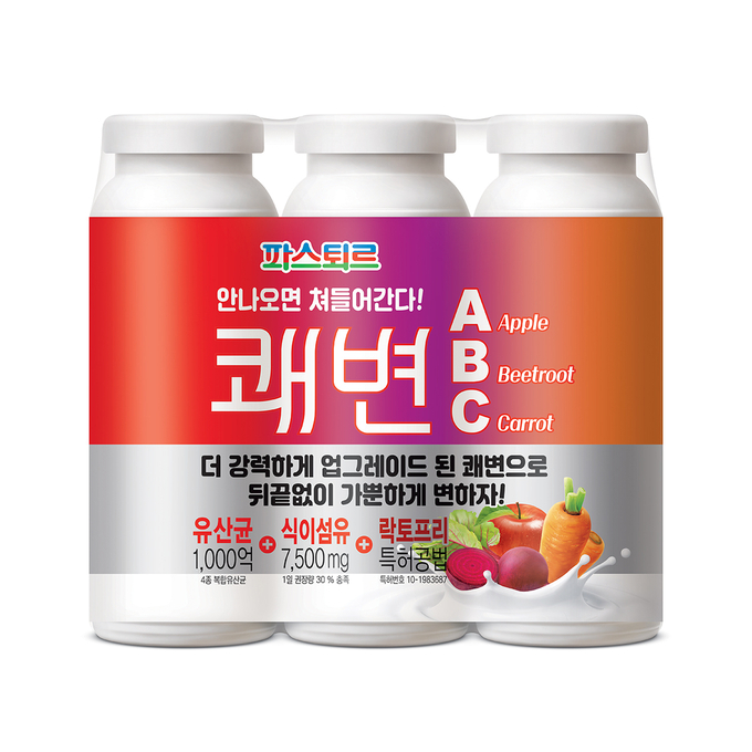[푸드투데이 = 조성윤기자] 롯데푸드(대표 이진성) 파스퇴르는 발효유 ‘쾌변 ABC 요구르트’를 새로 선보인다. 쾌변 ABC 요구르트는 일명 ‘ABC주스’로 널리 알려진 건강주스 레시피 ‘사과(Apple), 비트(Beet), 당근(Carrot)’ 조합을 장 건강 대표 발효유 쾌변에 접목한 것이다. 최상의 맛을 위해 사과, 비트, 당근의 황금 비율인 1:0.3:1 비율을 적용했다.