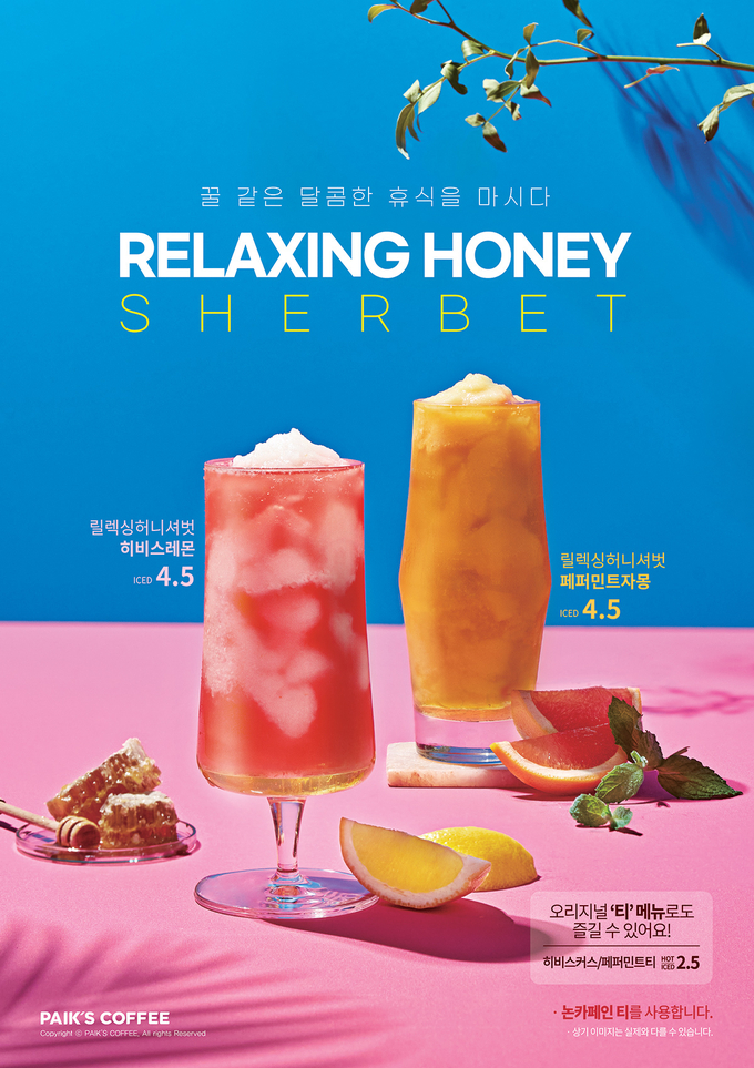 [푸드투데이 = 황인선기자] 더본코리아의 커피전문점 브랜드 빽다방(대표 백종원)이 상큼한 과일 베이스에 논카페인 티를 더한 여름 시즌 신메뉴 '릴렉싱허니셔벗 2종'을 출시한다고 6일 밝혔다.