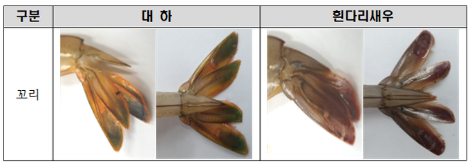 첫째, 대하와 흰다리새우를 가장 쉽게 구별하는 방법은 꼬리의 색깔을 확인하는 것으로 대하의 꼬리는 녹색 빛이 띠지만 흰다리새우의 꼬리는 붉은 빛이 돈다.
