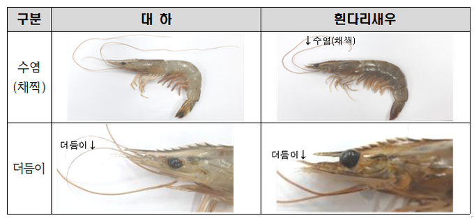 흰다리새우의 이마뿔의 길이는 코 끝보다 짧은 반면 대하의 이마뿔은 코 끝보다 길게 앞으로 나와 있어 눈으로 식별이 가능하지만, 이마뿔은 어획하거나 유통 중에 훼손될 수 있어 구별기준으로 한계가 있다.